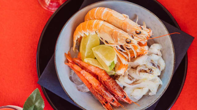 Sashimi di salmone, sashimi di tonno, seppioline crude, scampi, battuta di gambero rosso