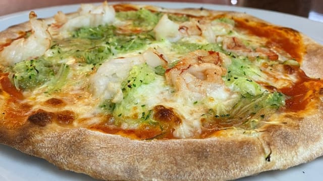 Tomàquet, mozzarella, pernil dolç, xampinyons, xoriç picant i gorgonzola.