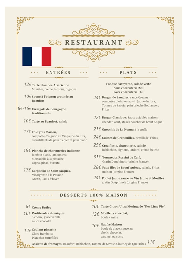 AlsatianFrenchItalianSavoyardEuropeanBachelor partyBirthdayBistroBrasserieFrom marketGood for a business lunchGood for familiesGood for groupsLunchOutdoor diningRestaurant hotelRomanticSeminarTraditionalWeddingWith friendsGluten freeLactose intoleranceLocally producedNut allergiesPeanut allergyVegan dishesVegetarian dishesChildren's menuDog-FriendlyWifi