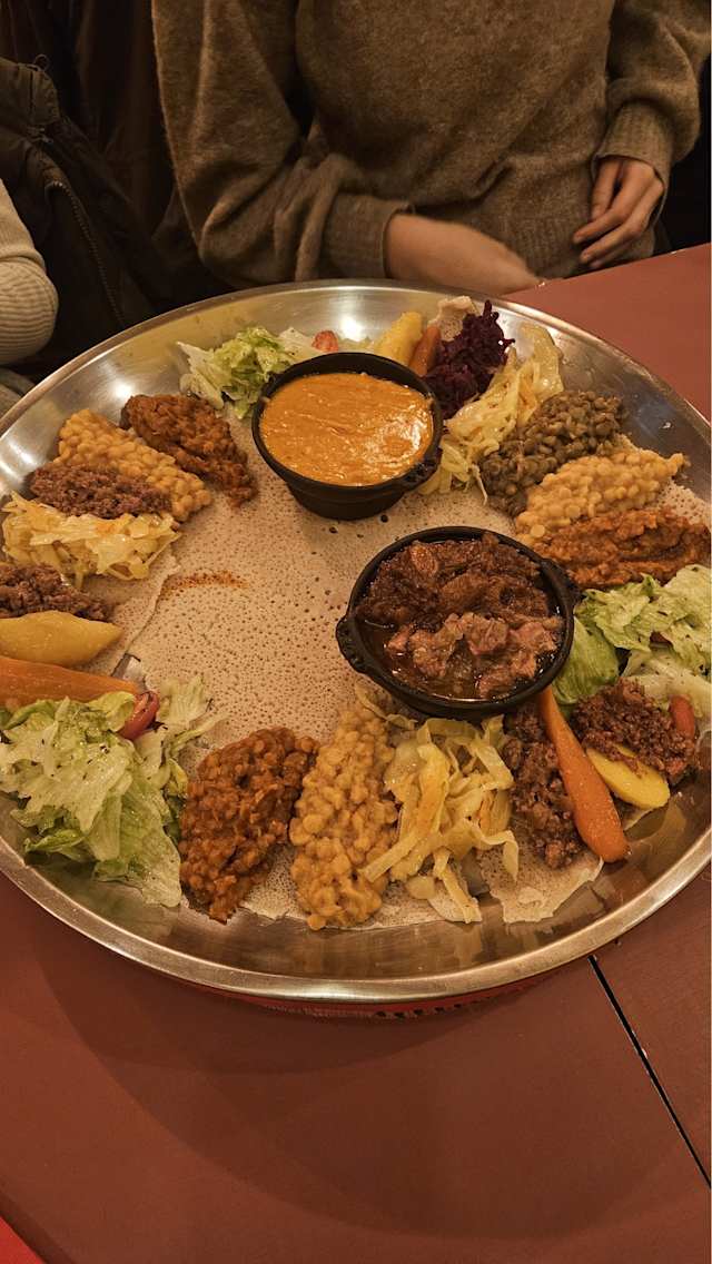 - Mehaberawi - assortiment de spécialités éthiopiennes variées servies sur une injera avec viande et volaille.