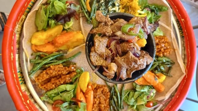 Mehaberawi - assortiment de spécialités éthiopiennes variées servies sur une injera avec composition végétarienne.
