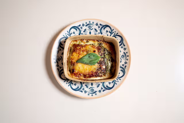 - Gratinado de berenjena, tomate, mozzarella fior di latte di agerola y parmigiano reggiano.