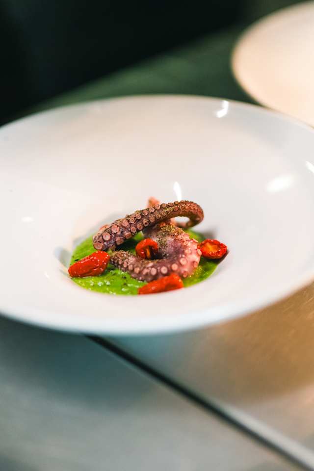 Polpo C.B.T. alla piastra con crema di broccoli, polvere di capperi e pomodori confit
