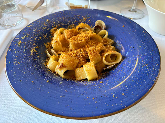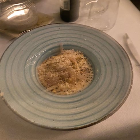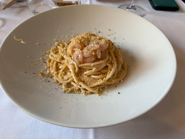 8.5/10Wonderful evening! Wine choice recommended by our waiter was perfect. Zucchini flan in crispy parmigiana cup was delicious. Shell fish in light sauce was yummy, if a bit messy. My wife’s prawns were good too. The deconstructed lime cheese cake with crumbles was also awesome. We are not big eaters so were hoping to share a simple pasta with white wine sauce to sock up the spectacular broth and add a little zest to an already fantastic evening.