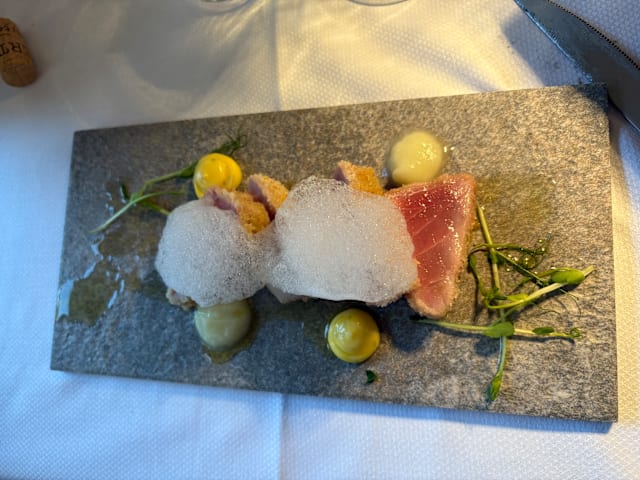 10/10Great seafood dinner of fried calamari, grilled prawns, tuna sashimi with pistachios, sea bass and mackerel. Everything was cooked perfectly and was delicious. Fun “deconstructed” cheesecake for dessert topped it off. Excellent service and nice ambiance. Our second time here, and we would go again. Definitely recommend for a nice evening out.
