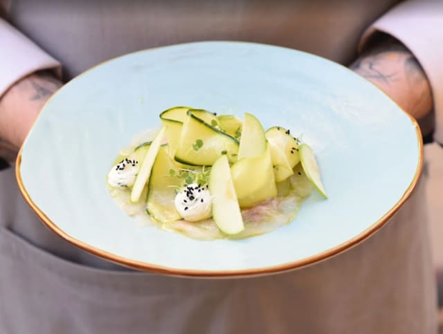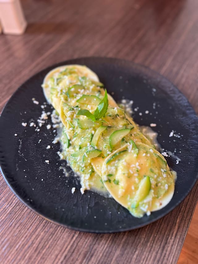 Pâtes fraîches fourrées au cacio et poivre, reposant sur une onctueuse crème de courgette,