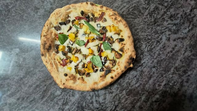 (Provola, porcini, salsiccia, patate al forno, basilico)