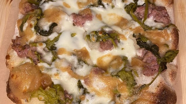 Mozzarella fior di latte, salsiccia, peperoni al forno, pomodorini freschi e olive taggiasche