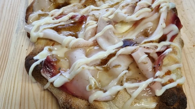 Passata di pomodoro mutti, mozzarella fior di latte, salame piccante, gorgonzola, funghi trifolati, olive taggiasche e basilico