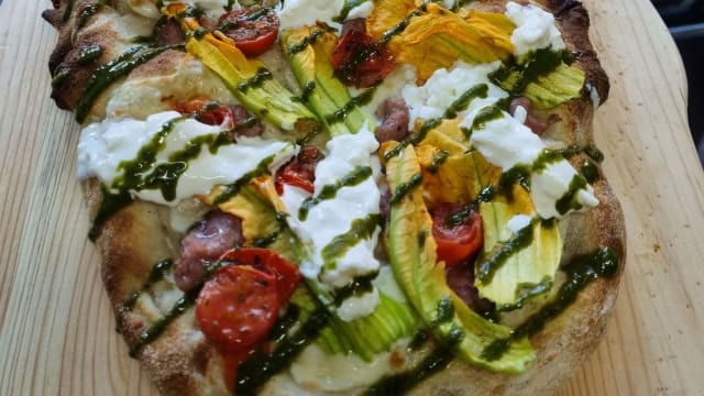 Salsiccia, stracciata di burrata in cottura, pomdorini rossi confit, fiori di zucca* e dressing di basilico