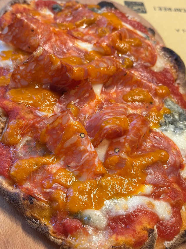 - Pomodoro, fiordilatte di agerola, gorgonzola, spianata calabra, crema di peperoni