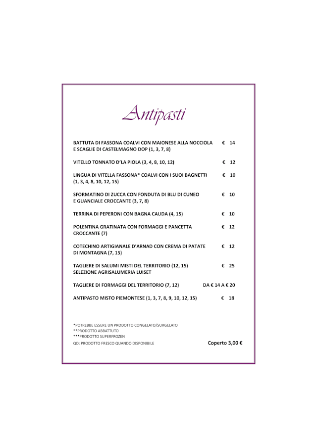 ItalianPiemonteseEuropeanGood for familiesSeminarWith friendsVegetarian dishesAmerican ExpressWheelchair AccessibleWifi