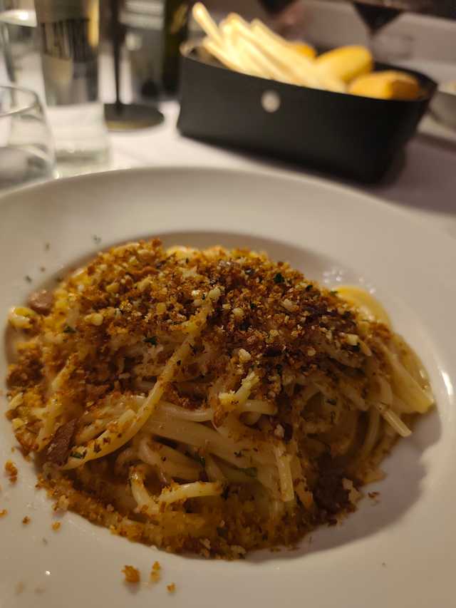 - Spaghetto al burro di montagna. Colatura di alici e mollica di pane tostato