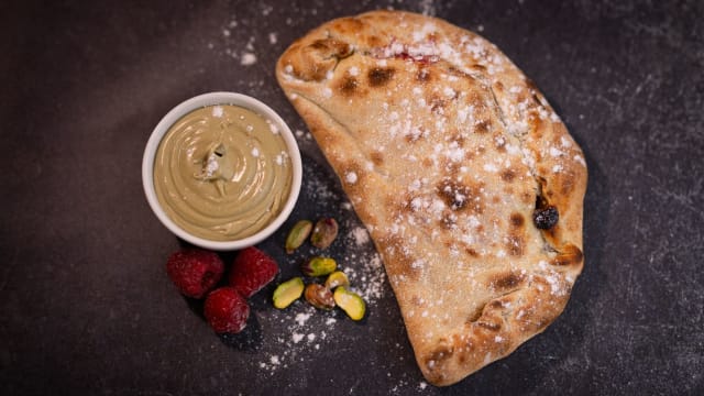- Sauce tomate, mozzarella Fior di Latte, mortadelle fondante à coeur, roquette, pistaches grillées