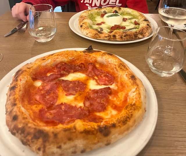- Pomodoro san marzano D.O.P., salame piccante, fior di latte, basilico