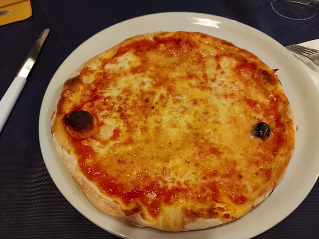 - Pomodoro, mozzarella, prosciutto cotto, funghi, carciofi, olive nere