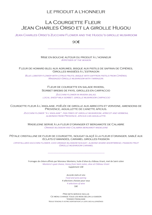 10/10What a haven this lovely restaurant is. Just walking through the front door the diner feels special-warmly greeted, led to one of several cozy dining rooms on split levels or to the outside terrace and then immediately started off with a beautifully presented chef's choice amuse bouche. From there, there are three prix fixe menu options-one seasonally based, one based on memorable regional dishes the chef loved as a child, and one more "modern/signature". Menu pricing ranges from 85-130 euro for 3 courses-well priced given the excellent quality of food and service. There's an a la carte menu as well. Everything is delicious, beautifully presented, and can be well paired to wines by the glass or bottle-our waiter made great food and wine pairing suggestions, as well as being professional and friendly at the same time....best meal we had in Mougins!