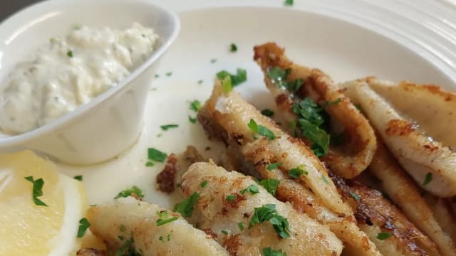 Fish & chips, (pangasius), pommes frites, sauce tartare & petite salade