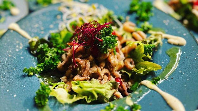 Octopus, butter, salt, pepper, garlic, parsley, spicy green chile sauce