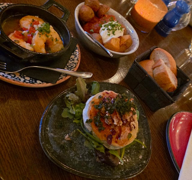 7/10not very Spanish, it is a cross over. The hamburger was good, the paella was not a paella...just rice with scampi and 3 black mussels.The artichokes were delicious.