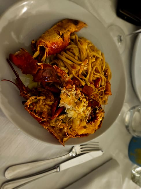 10/10The waiter was very friendly and helpful, advising about choice of wine with our food selection. We had the red prawn starter, which was delicious, followed by the lobster pasta with raisins and almonds, which was excellent and a clever use of local ingredients. We sat on the outside tables, benefiting from a great view of the lovely buildings . Altogether fab!