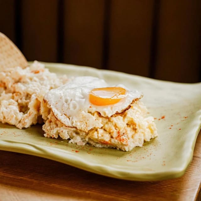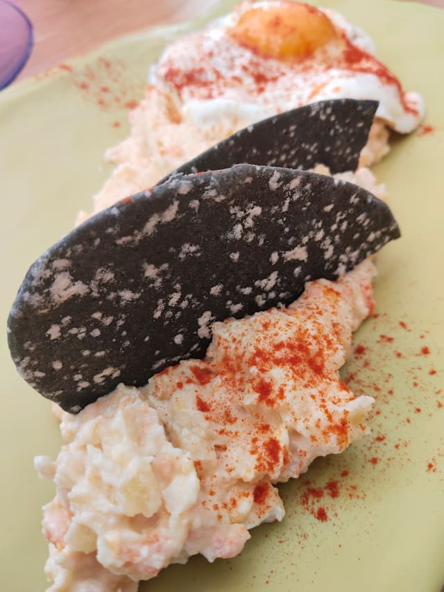 Ensaladilla de gambas al ajillo con mayonesa suave, huevo plancha y crujiente regañá con pimentón.