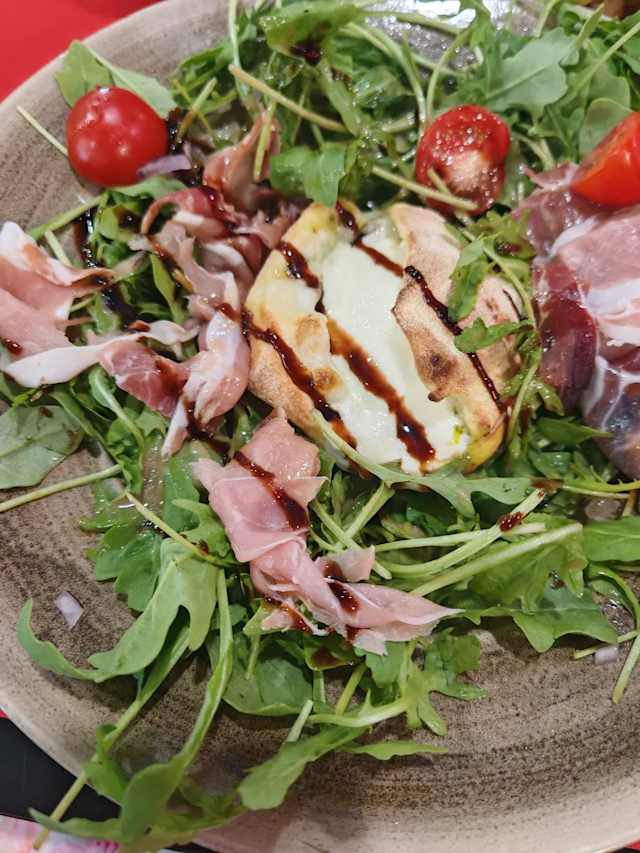 - Roquette, burrata (entourée de pâte à pizza base pesto), jambon Italien, oignons rouge, tomates cerises, balsamique, persil, vinaigrette.