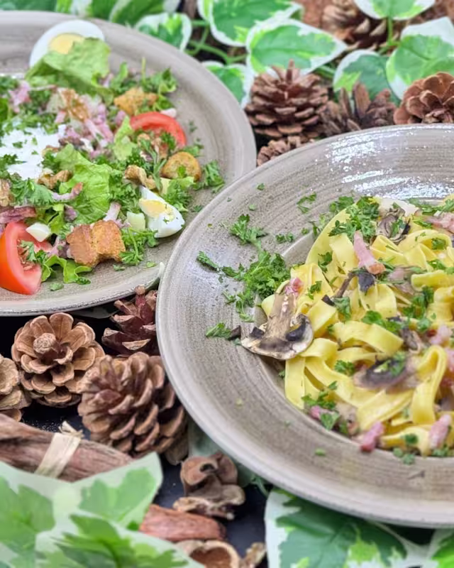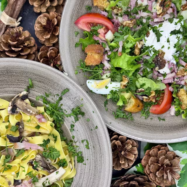 - Salade verte, lardons, pommes de terre, noix, croûtons, oeufs, tomates, crème, persil, vinaigrette.