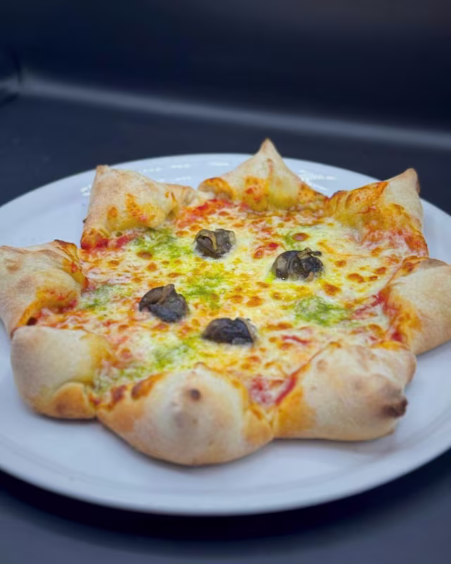 - Roquette, burrata (entourée de pâte à pizza base pesto), jambon Italien, oignons rouge, tomates cerises, balsamique, persil, vinaigrette.