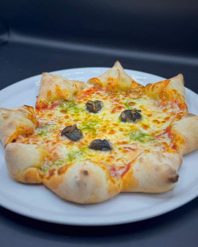 - Roquette, burrata (entourée de pâte à pizza base pesto), jambon italien, oignons rouge, tomates cerises, balsamique, persil, vinaigrette.