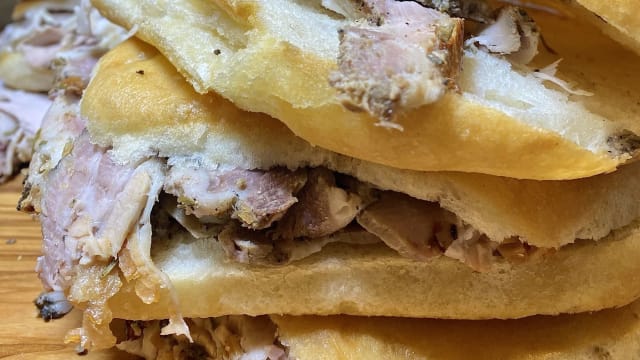 Porchetta, salsa a base di gorgonzola dop aromatizzata al tartufo, pomodori secchi, mandorle tostate