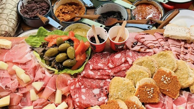 4 tipi di salumi, 3 tipi di formaggi, 3 tipi di crostini, 2 salumi speciali, 1 formaggio gourmet e l crostino speciale, verdure al forno, confettura, miele e frutta di stagione