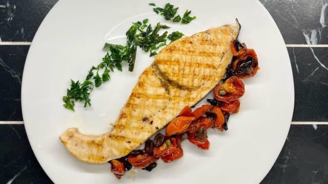 La grigliata mista: trancio di pesce spada, trancio di tonno rosso, seppia, polpo e gamberone