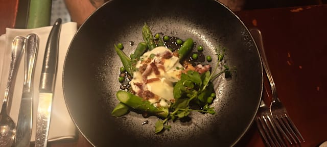 Poached egg, salad of asparagus from Mechelen with hazelnuts and parmesan