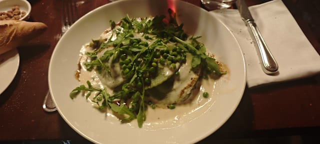 Ravioli with asparagus, sauce of parmesan, baby leaf spinach and truffle jus