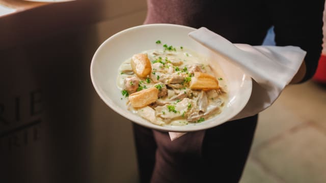 Fricassé of Bresse chicken AOP from our farm 'le Devant' and feuilletés with truffle