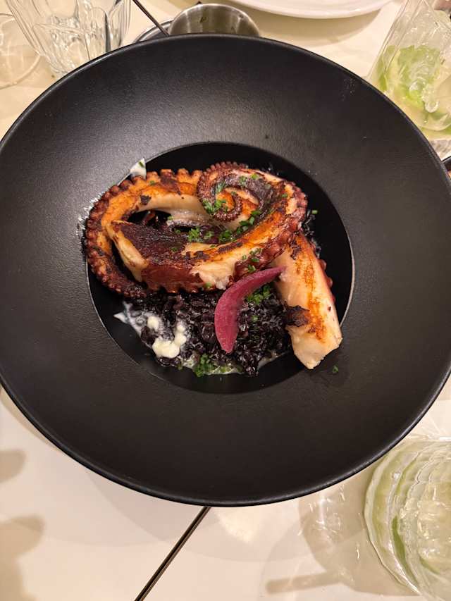 - Tentacules de poulpe grillées, riz noir «vénéré» sauté à la crème d’ail