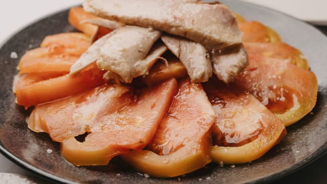 En su punto de sal, con tomate rallado y tostas de pan de cristal