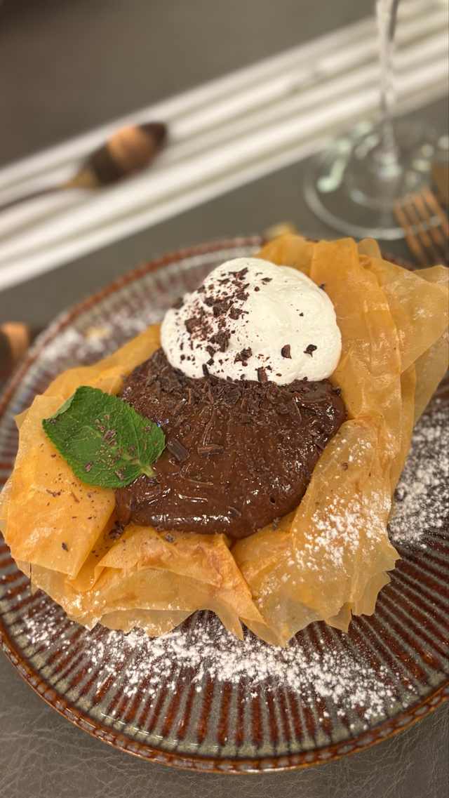- Semi-frio de chocolate em cesta de massa crocante, com mousse de chocolate, bolacha, pepitas de chocolate e chantilly