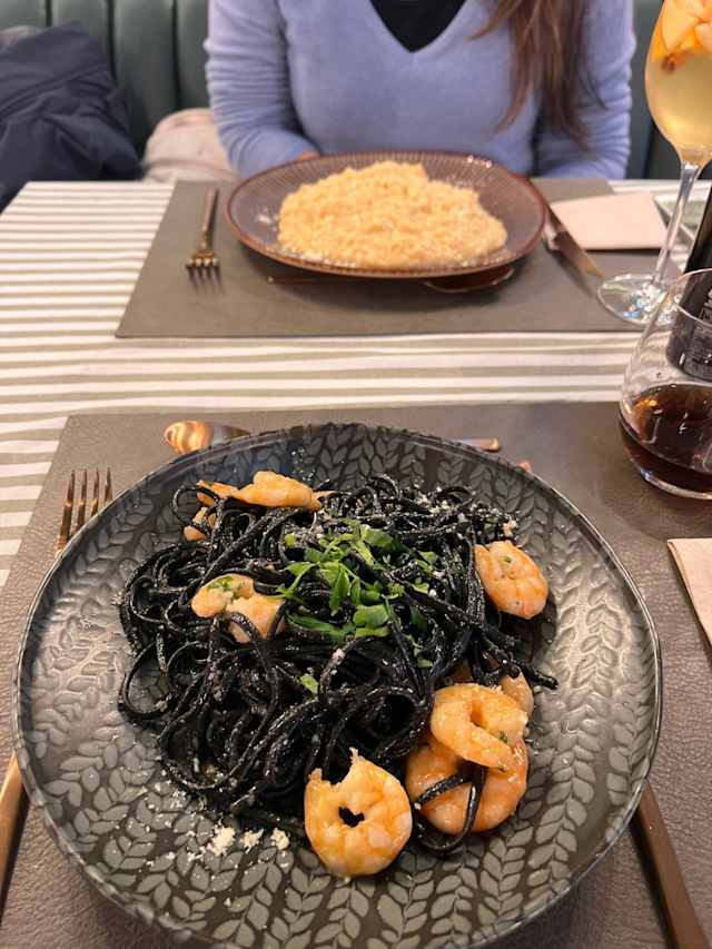 - Massa linguine de tinta de choco, bisque, camarão, alho, coentros e queijo parmesão