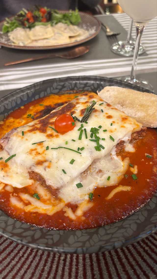 - Camadas de massa fresca, molho de tomate, carne picada, bechamel e queijo mozzarella, servido com mix de alfaces e vinagrete balsâmico