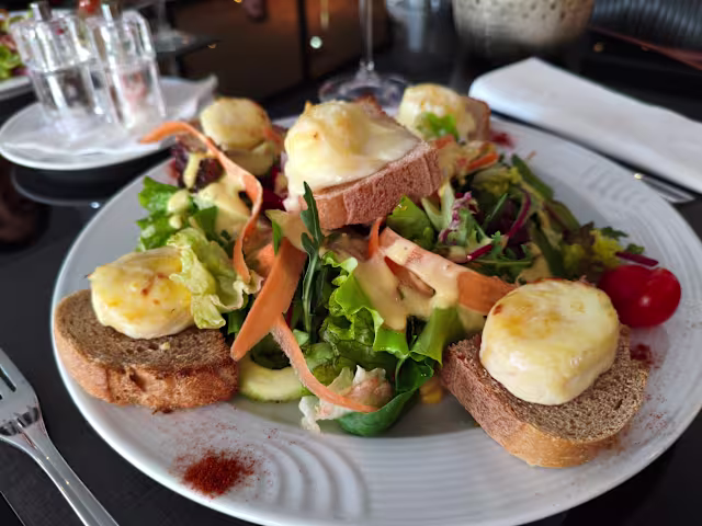 - Gruyère, tomates, oignons, mozzarella, salade, sauce cocktail maison (accompagnés de salade & pommes au four)