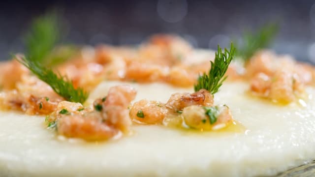 In crosta di lime e zenzero, crema di porri, julienne di porro fritto e fagiolini scottati