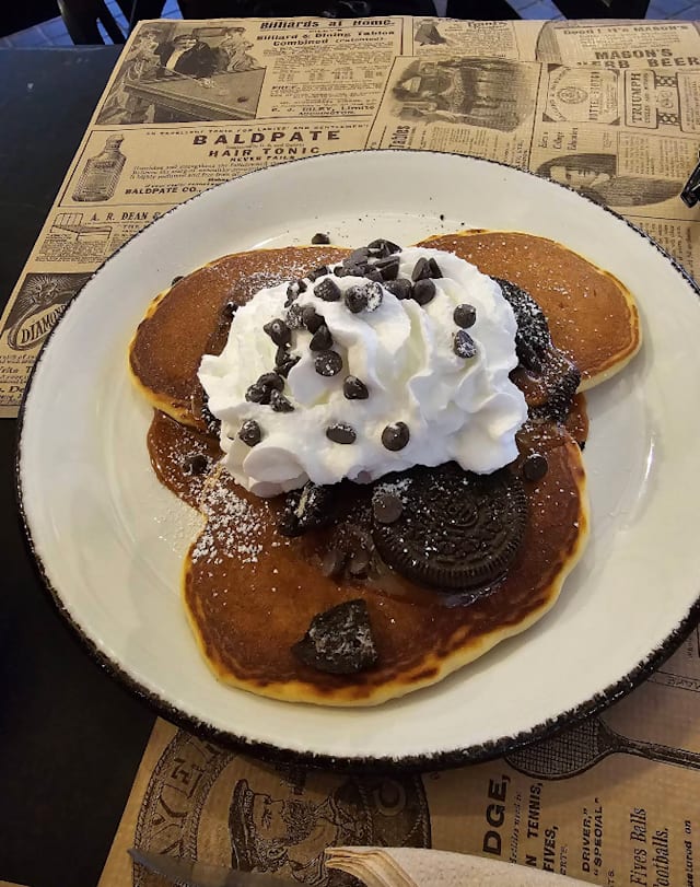 - 3 Tortitas con Cookies, chips de chocolate, nata y salsa de chocolate