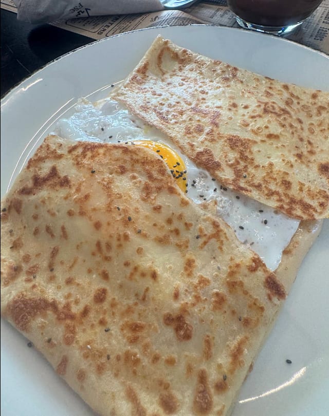 - Crep con almendras laminadas, nata, salsa de caramelo y helado de vainilla