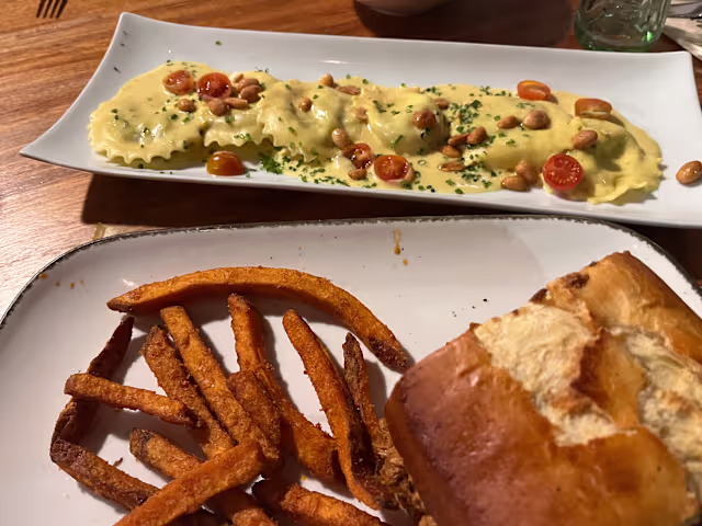 The staff was very nice but kept on forgetting things. Forgot to bring the bread that was supposed to arrive with the meal and only brought it after asking 3 times. One dish was very disappointing. Good coffee