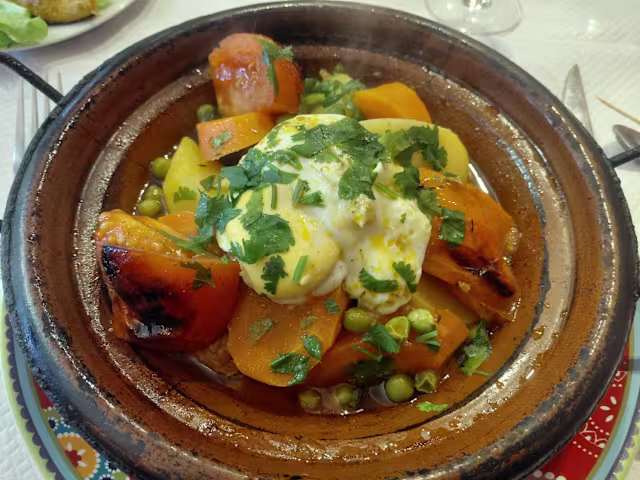 8/10The service and the ambiance were very nice. . This seems to be a popular spot and the restaurant was very well attended. The food was very bland though. My husband ordered Couscous with meat and I ordered the vegetarian version. The meal came in form of a soup with veggies for us to share and the meat was served separately. I suspect because I ordered the vegetarian version the broth we got was also vegetarian and that's maybe why it was so bland. The dishes on the other table had the protein served on the side too.