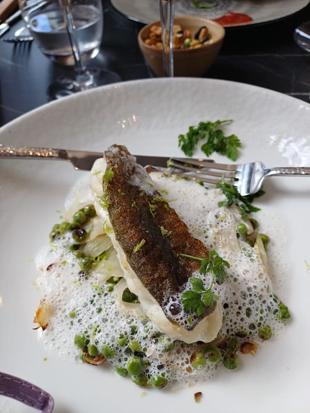 Pavé de cabillaud plancha, duo petits pois & fenouil, écume coco citronnelle