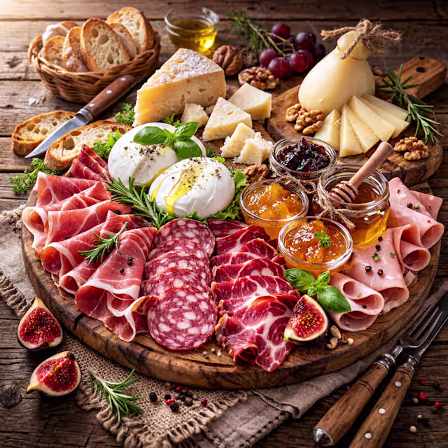 - Crudo,capocollo, salame, mortadella, mozzarella di bufala, pecorino locale, caciocavallo con marmellate e miele locali