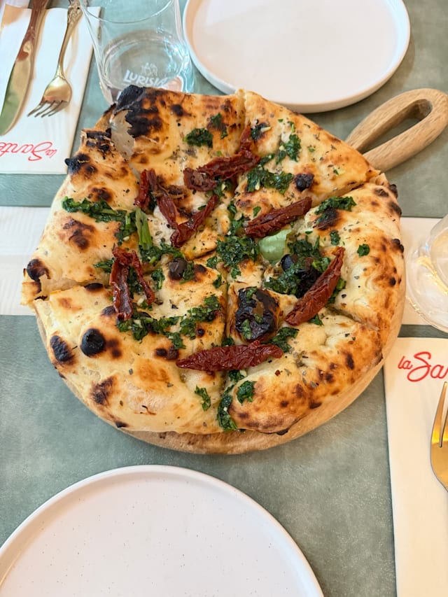 Sauce tomate, fleur de lait, aubergines, courgettes, olives, champignons